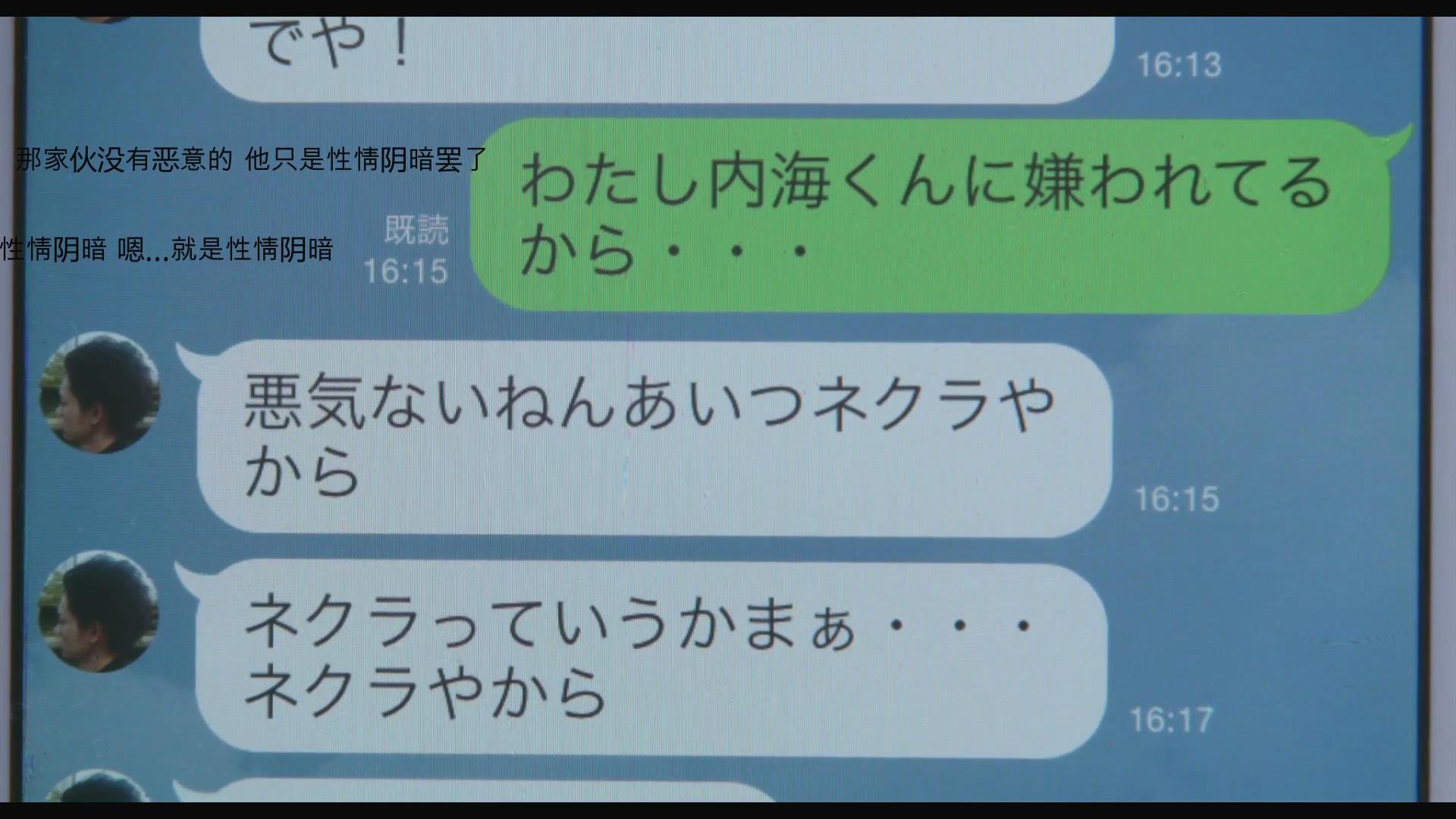 电影百分之九十的时间都停在一个画面,都只是两个人的对话,但一点都不让人乏味,就像是看过去自己的日常,他们关心的事和谈论的问题,也都是过去学生时代和同学会谈论的内容,很有亲切感。印象深刻的一个情节是,濑户喜欢的女生喜欢内海,但内海并没有表现出喜欢她的样子,在影片快要结束的时候,那个女生在好像受到内海间接的拒绝的时候,发了一条短信给濑户,内海他讨厌我。濑户第一反应是敲出了“但我喜欢你啊”这几个字,虽然他是没有心机的下意识行为,但这种在女孩子失落的时候的表白,比任何形式的安慰都好,哪怕仍然是被拒绝,也会给自己加很多印象分,对增进关系有极大好处。