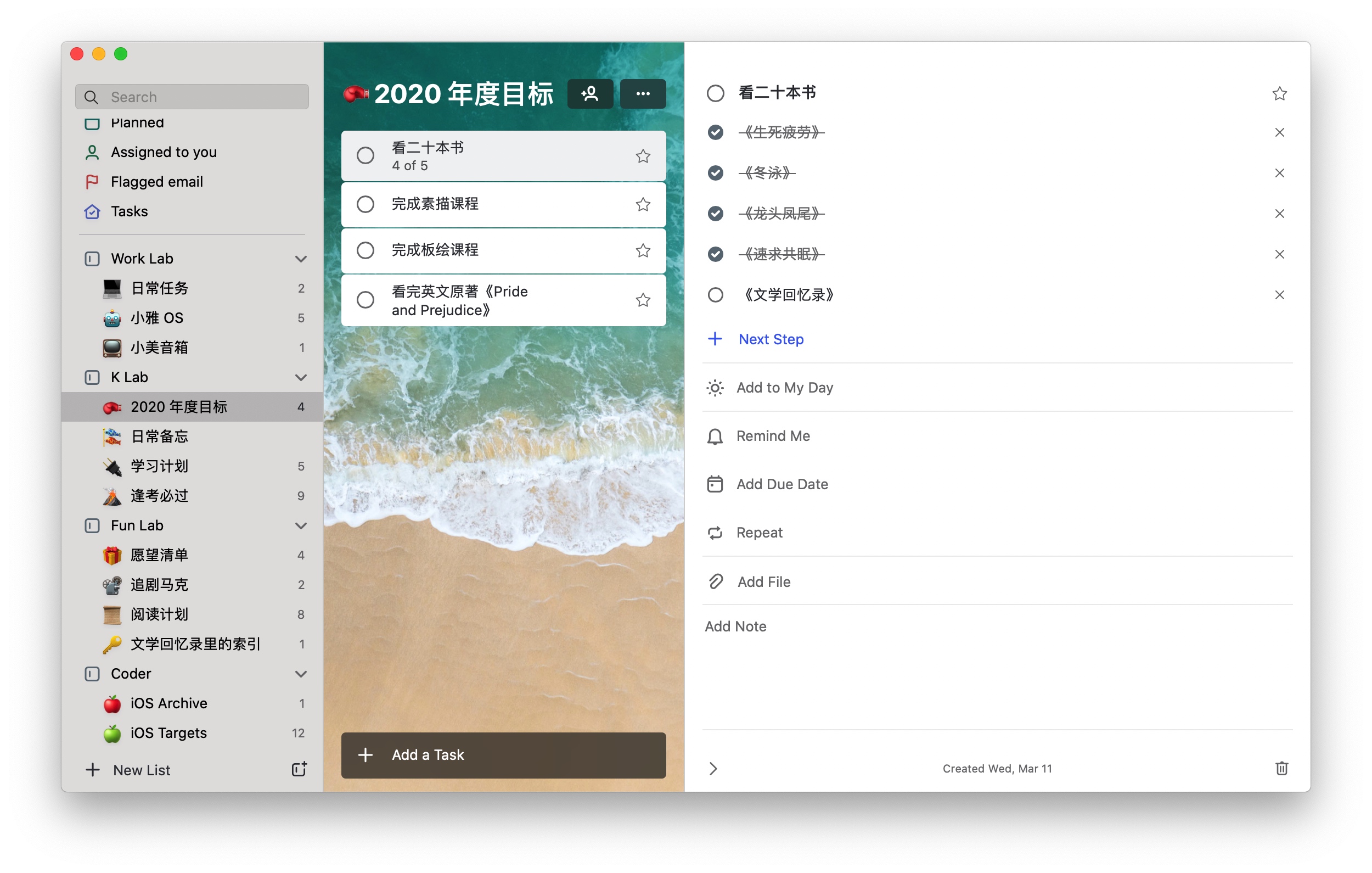 除此以外,还有一些频度不是很高的功能或是并不是功能性的,只是某个软件独有的小功能,我并没列出来,比如 Microsoft To Do 的任务清单设置背景,Things 自成风格的动画效果,滴答清单的任务评论。不过前两个虽然看似是一个差异性的功能,但实际使用却不是那么友好,Microsoft To Do 的任务清单设置背景,可设置的背景图片只有默认的几张,而且有的图片会比较突出某种风格,难以当成一个通用选择来用,而 things 的动画效果,初次使用时,特别是在移动端上着实有被惊艳到,但长时间使用下来,也发现一些问题,像比如在滴答清单,我们需要从一个任务的详细描述切换查看另一个任务的详细描述,我们只需要点击一下,即可完成切换。但在 things 上,如果你展开了一个任务,首先要在展开任务以外的区域点击一下收起,然后在另一个任务上双击才可暂开。对于习惯每天早上打开电脑都会过一遍手头上所有任务及及其细节的我来说,实在有点疲惫。